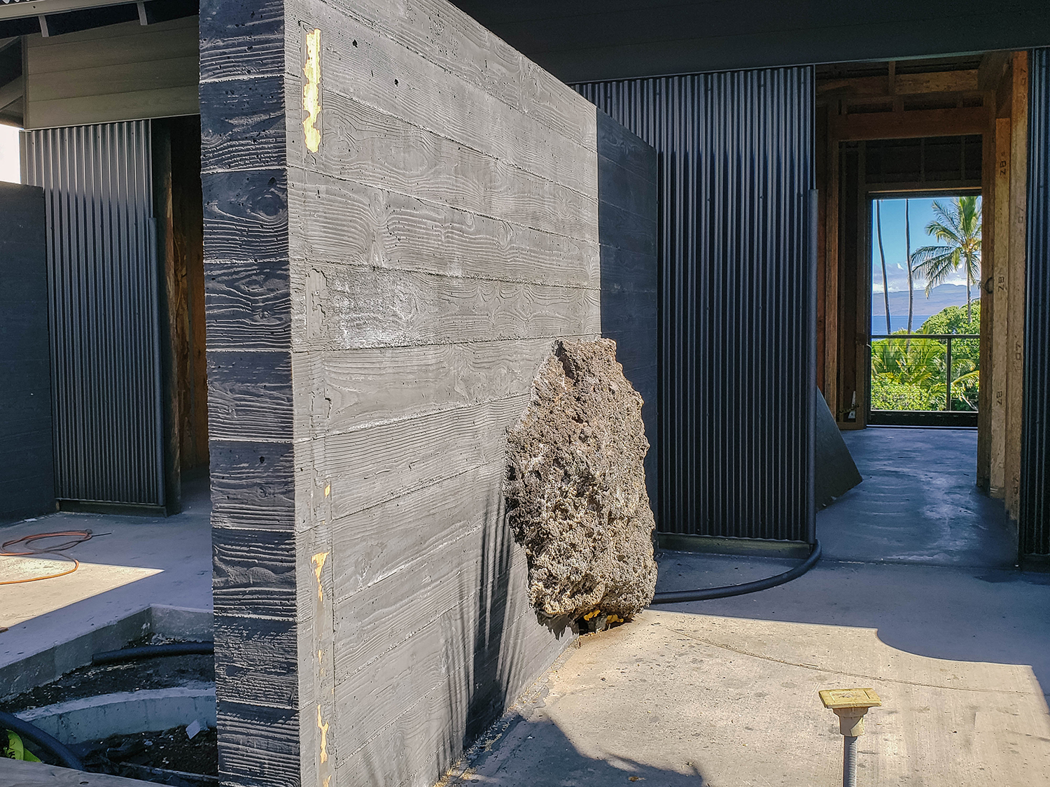 Dubbed the “Volcanic Rock” home, this newly built Kona residence achieved the sought-after harmony with its natural surroundings by its literal integration of volcanic rock into its board-formed concrete walls.